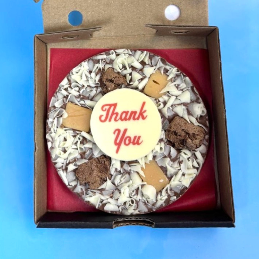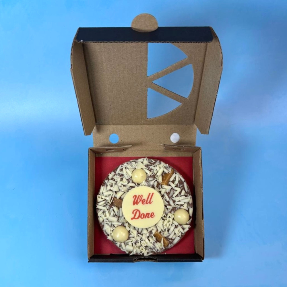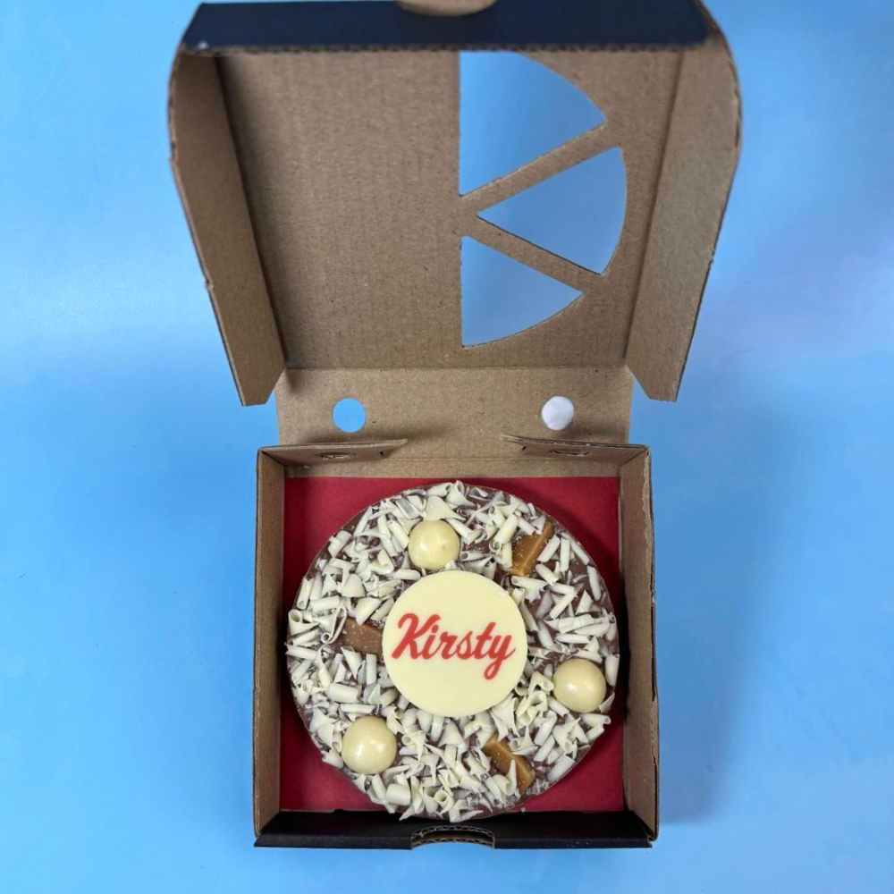 All of our personalised chocolate pizzas are made from real Belgian milk or dark chocolate flavours, decorated by hand with your chosen toppings, and finished with a Belgian white chocolate plaque - so your gift will be as delicious as it is fun!